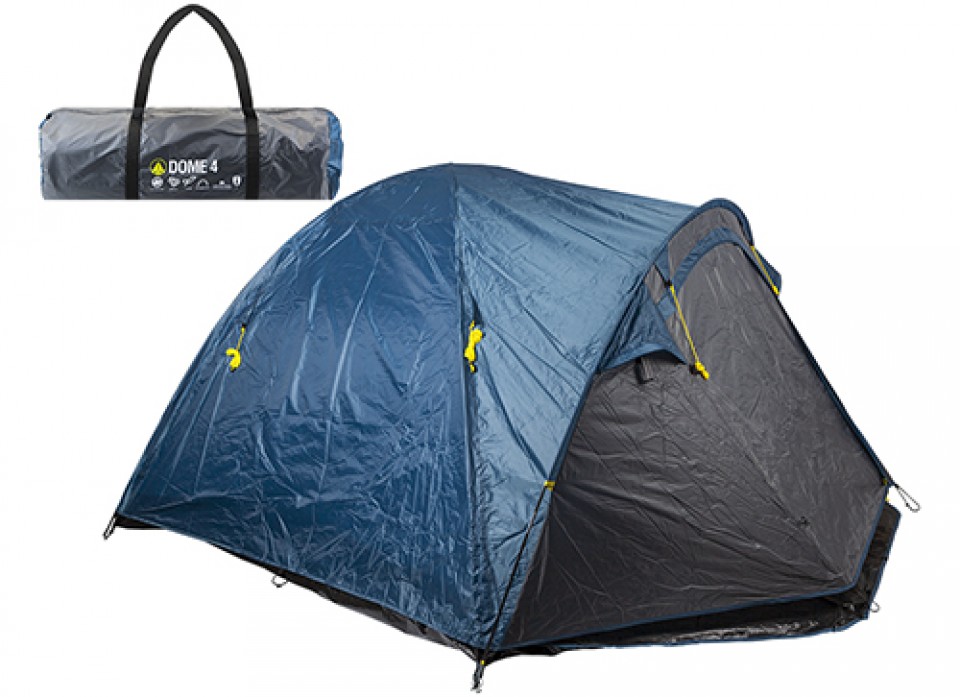 Summit 4 person double skin dome shape tent, with taped seams with side and back vent, breathable polyester mesh door.