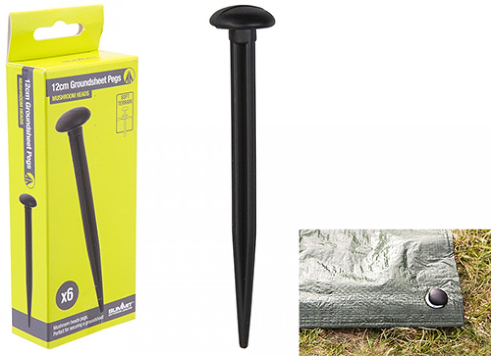These Mushroom Pegs which come in a pack of six are designed to secure ground sheets into soft ground/terrain. The peg itself is shaped like the top of a mushroom to help minimise the risk of injury on campsites. The pegs are an ideal camping accessory.