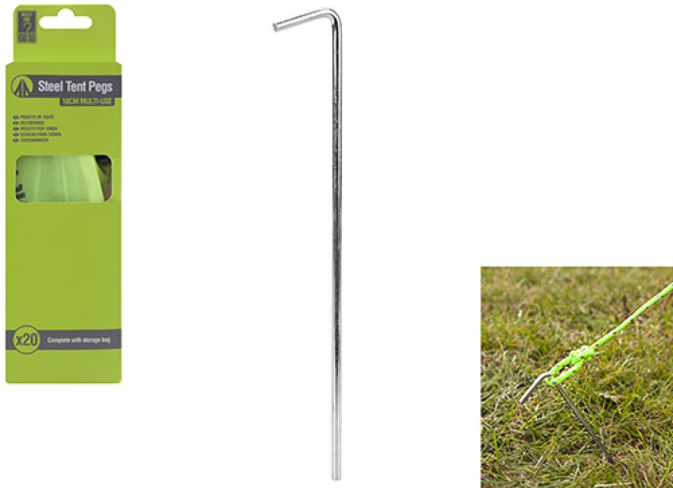 These packs of 20 steel tent pegs are perfect for when pegs get lost, bent or worn out. The pegs are an ideal camping accessory. Supplied in a convenient resealable PVC bag for easy storage.