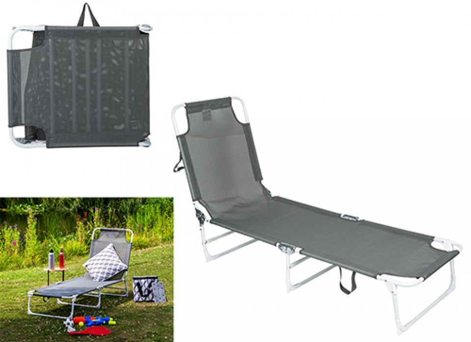 This sturdy sun bed features several reclining positions and carry handles.
