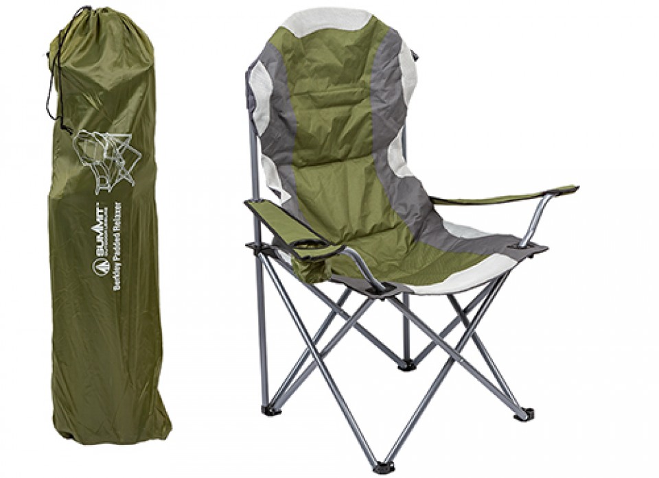 The Summit Forest Green Padded Relaxer Chair is great for camping, festivals, fishing or just relaxing in the garden. It has a lightweight frame and comfortable padded seating. It features a handy drinks holder on the arm rest and can be folded and stored compactly in its own carry bag for easy transportation.