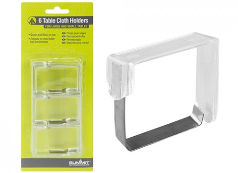 A simple yet effective way to secure your tablecloth on windy days with this set of 6 clear plastic clips. The spring loaded clips will fit tables up to a maximum of 3.5cm thick. The table cloth clips are easy to install and take off. Simply slide them on and the clips will self-adjust to hold tablecloths tightly in place.