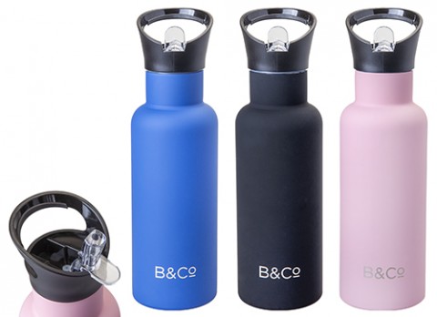 B&Co double walled bottle with a convenient flip straw in assorted colours.