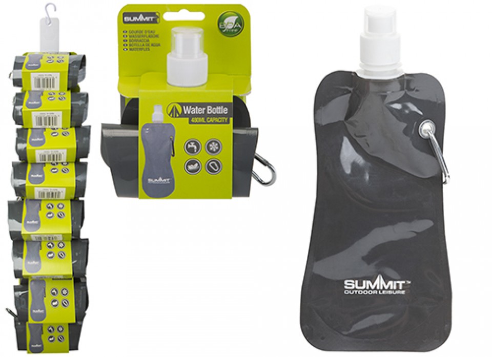Quality folding water bottle with silver carabina clip. Ideal for easy storage.