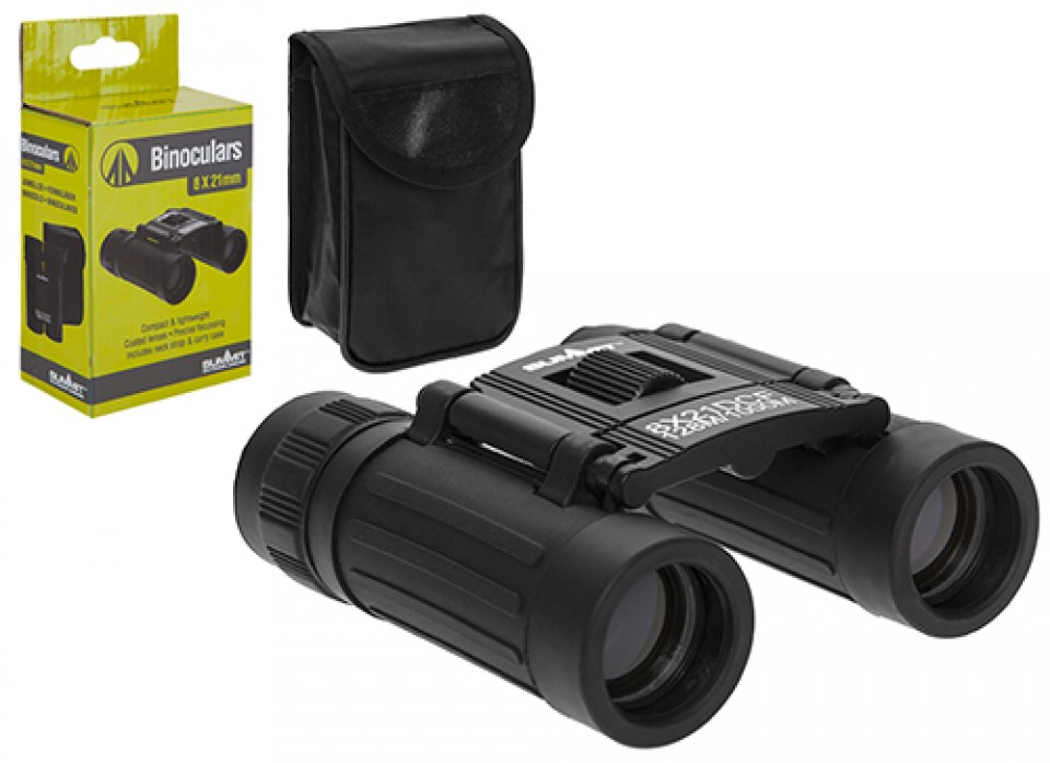 Binoculars with an 8x magnifications, an object lens diameter of 21mm and a 7.20 angle view. Supplied with a handy carry case.
