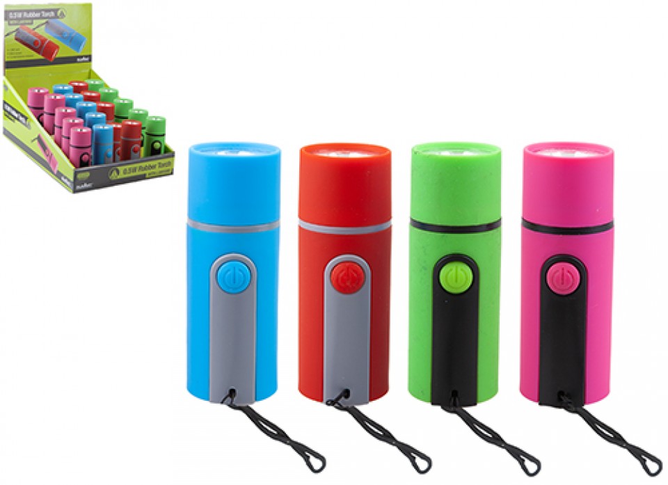 Strong rubber torch with lanyard in 4 bright colours.