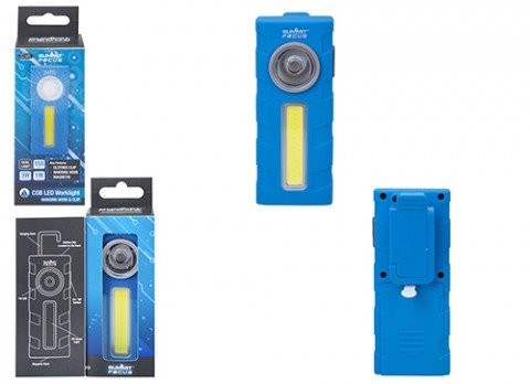 Summit Focus work light with clip on attachment to the back of the torch. Soft blue rubber outer with small but strong magnetic to the base. Press button functions and hanger.